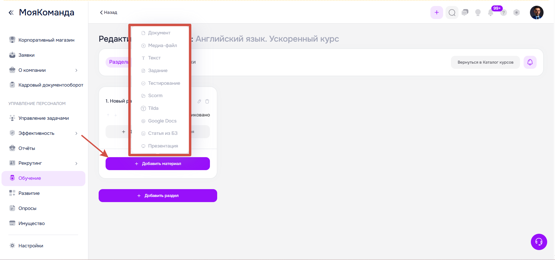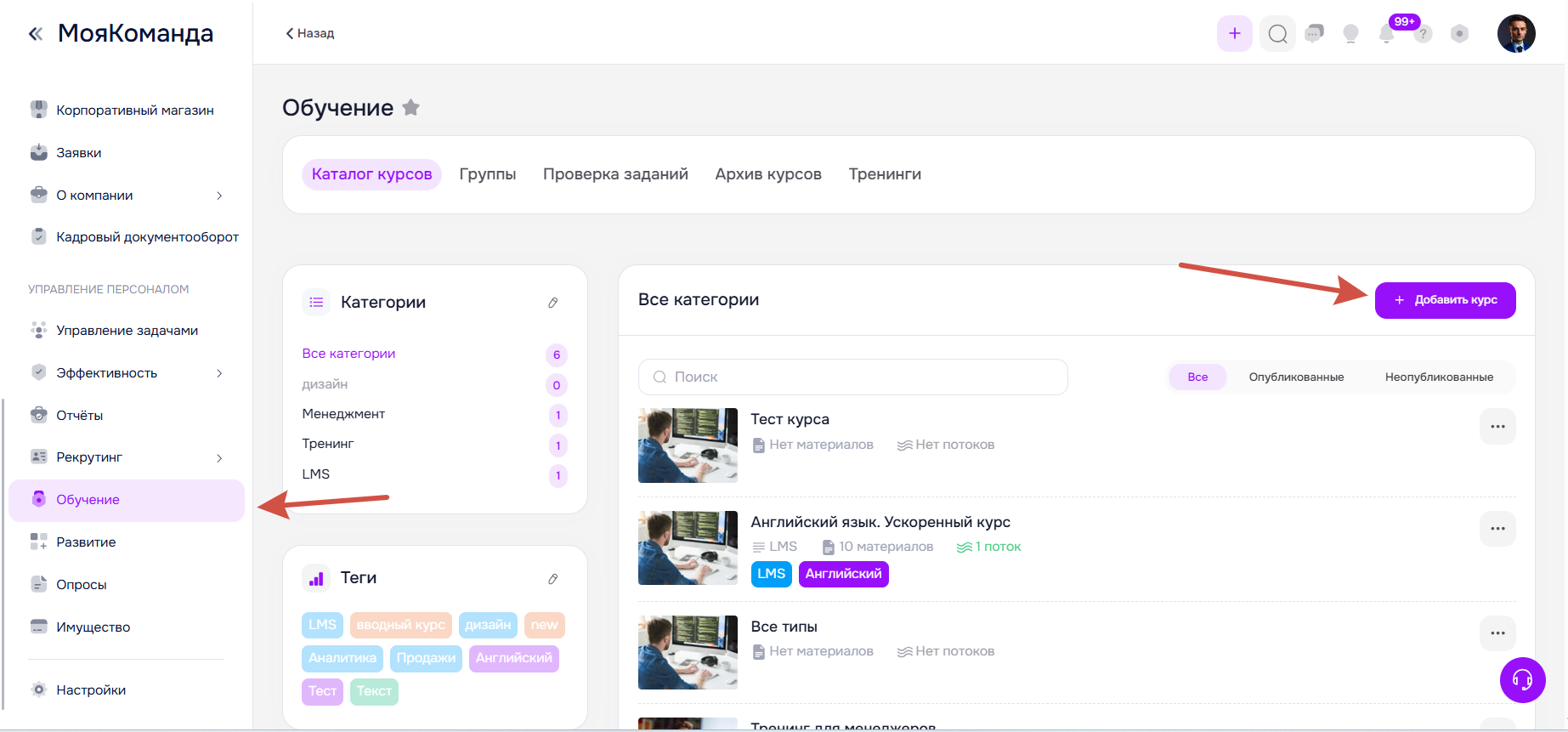 Чтобы создать новый курс на платформе перейдите в раздел Обучение в левом меню и нажмите кнопку Добавить курс.