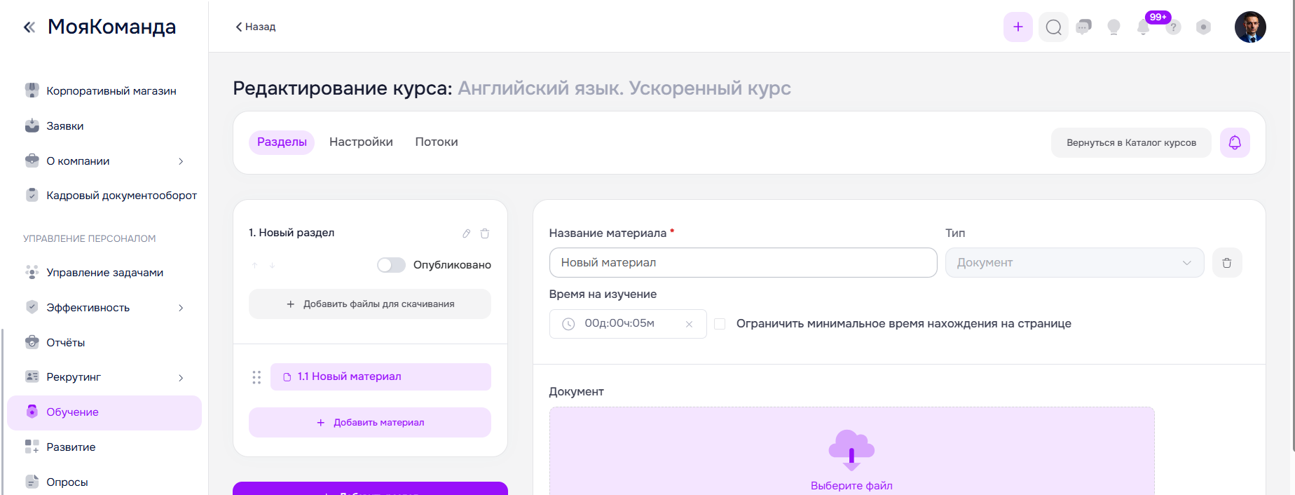 Во всех типах материалов необходимо указать название материала, а также время на его изучение (по умолчанию 5 минут). Из времени на прохождение каждого материала складывается примерное время прохождения курса. Также можно ограничить минимальное время нахождения на странице материала. Сотрудник не сможет завершить материал, если не проведёт на его странице указанное время на изучение.