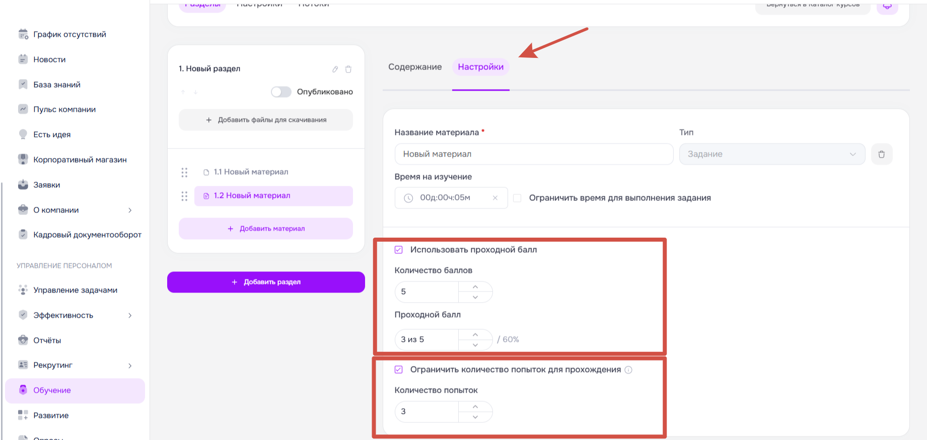 Также обратите внимание, что для материалов типа Задание есть вкладка Настройки, на которой можно задать: