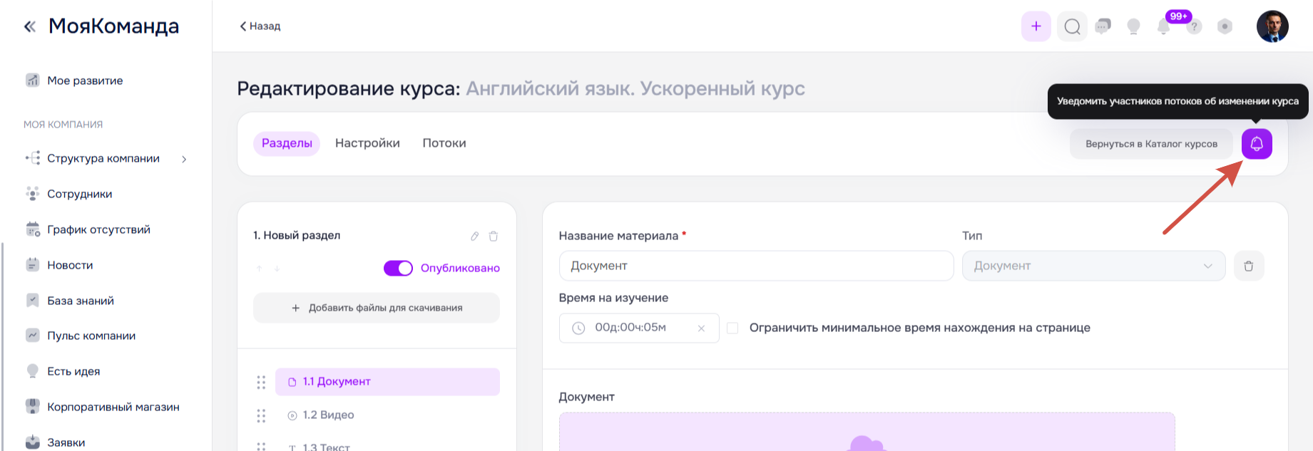 Если вы обновите курс (измените/добавите/удалите материал или раздел), то сможете уведомить об изменении учеников, уже прошедших курс. Для этого на странице курса нажмите кнопку Уведомить участников потоков об изменении курса. Обучающиеся, прошедшие курс, получат уведомление о том, что в курсе появились изменения, и смогут посмотреть обновлённые материалы.
