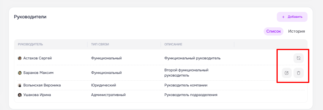 Доступные действия с функциональным руководителем в профиле сотрудника зависят от способа его назначения: