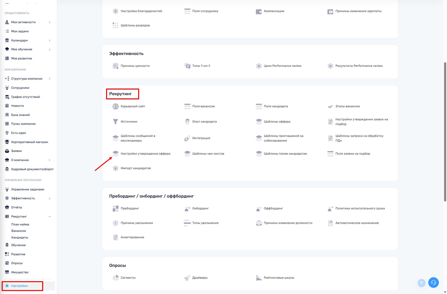 1. Перейдите в «Настройки → Рекрутинг → Настройки утверждения оффера».