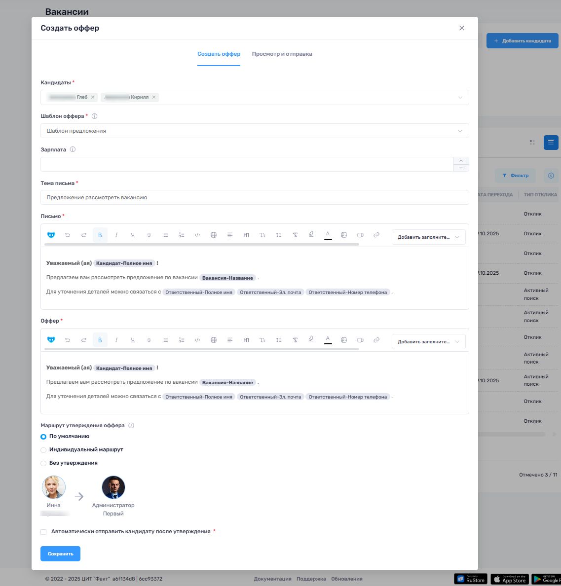 | Оффер утвержден | Все утверждающие сотрудники согласовали оффер. Теперь он готов к отправке кандидату |