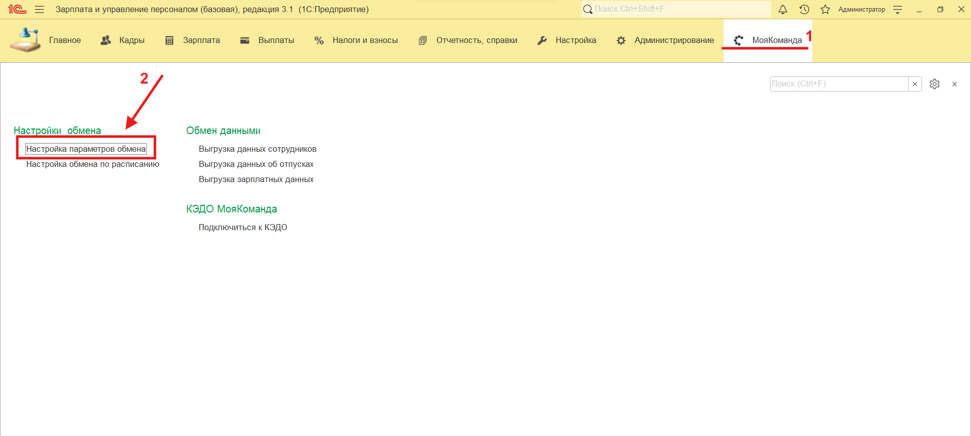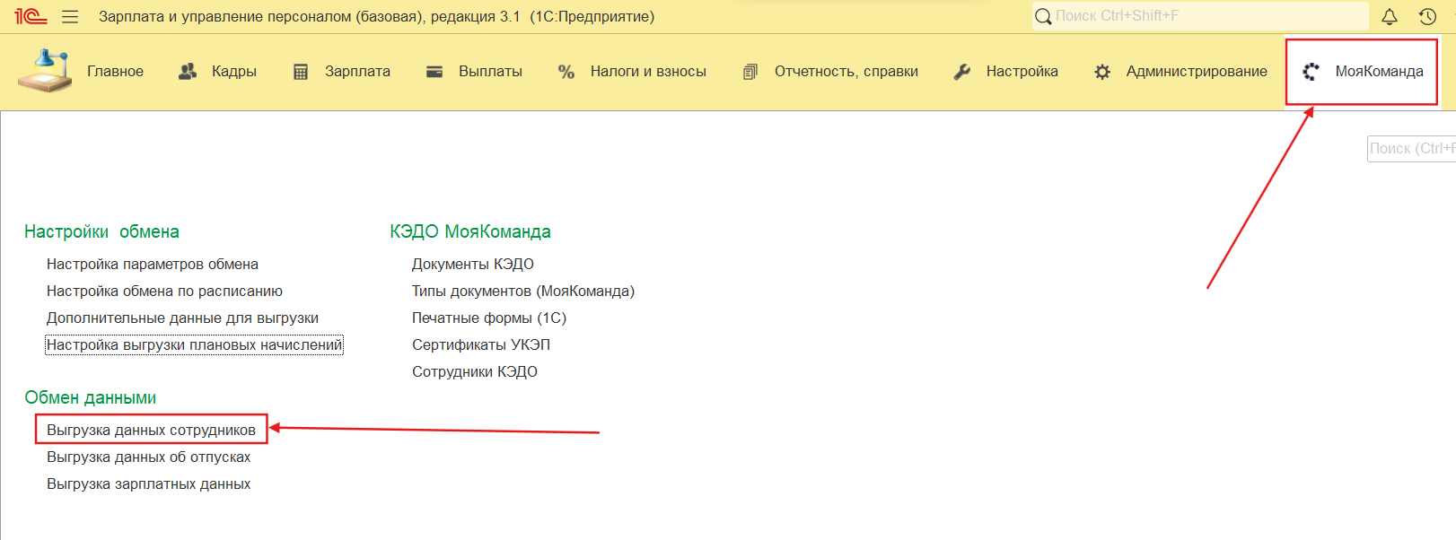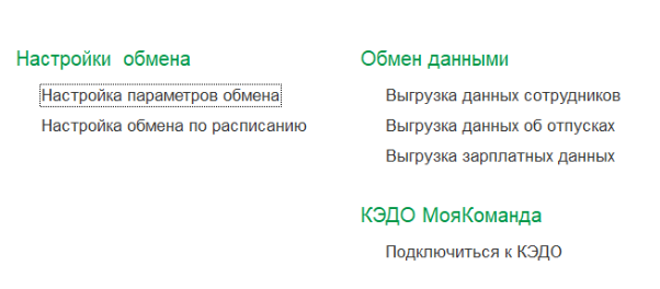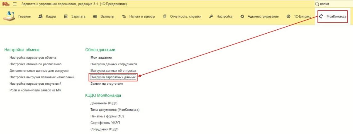 4. Чтобы активировать пункты меню для выгрузки кастомных полей и плановых начислений, нужно перейти в раздел “МояКоманда” и выбрать пункт меню “Настойки параметров обмена”
