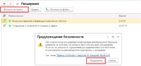 5. Нажимаем «Добавить из файла». Читаем предупреждение безопасности и нажимаем «Продолжить».