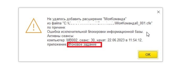 Важно: При открытии файла возможно появление следующего сообщения об ошибке. Оно означает, что системой (или каким-то из расширений, например 1с Битрикс) запущен автоматизированный процесс обновления (актуализации) данных через интернет, по этой причине заблокировано обращение к нужным нам базам данных 1С. В этом случае следует дождаться завершения фоновых процессов (подождать несколько минут) и повторно запустить установку расширения из файла. Если установка по-прежнему не удается, попробуйте закрыть 1с ЗУП, проверьте в диспетчере задач, что в процессах (в том числе в фоновых) нет 1cv8c и других программ, обращающихся к базам 1с (интеграций), которые могут помешать процессу установки.