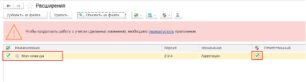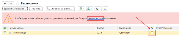 Затем перезапускаем 1с снова и авторизуемся. Повторяем действия по добавлению расширения, описанные выше.