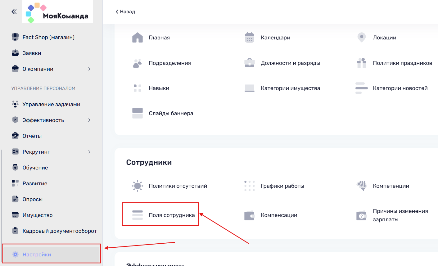 1. Перейти в Настройки и выбрать раздел “Поля сотрудника”
