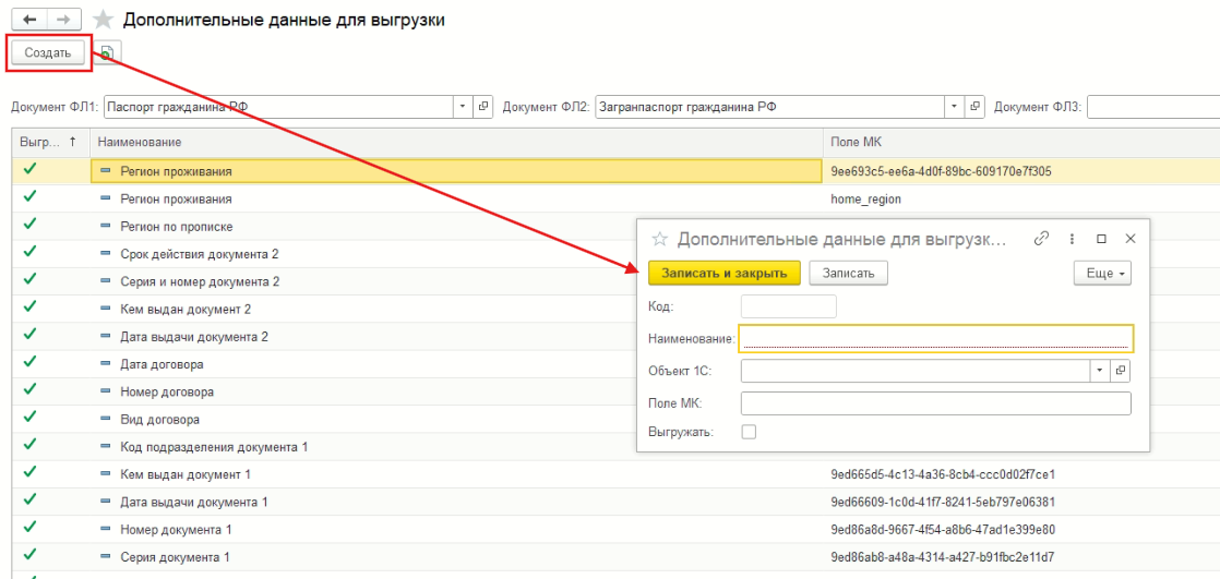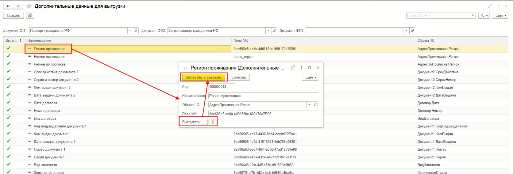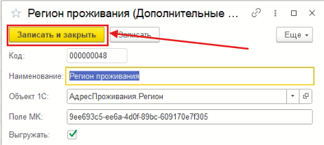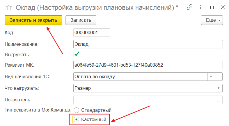 Важно: Если это поле больше не нужно выгружать из 1С в МояКоманда нужно двойным щелчком по выбранному полю снова открыть модальное окно настроек кастомного поля и выключить чекбокс “Выгружать”. После чего обязательно нажать кнопку “Записать и закрыть”.
