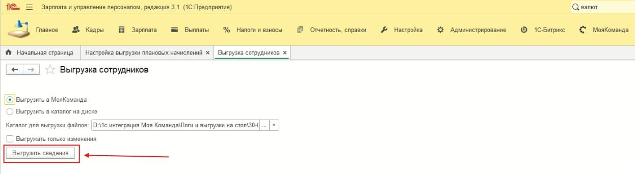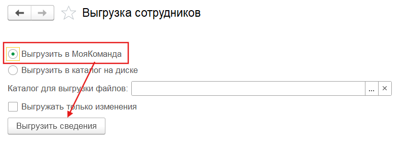 8. В этом разделе выбрать пункт “Выгрузить в МояКоманда” и нажать на кнопку “Выгрузить сведения”