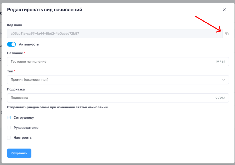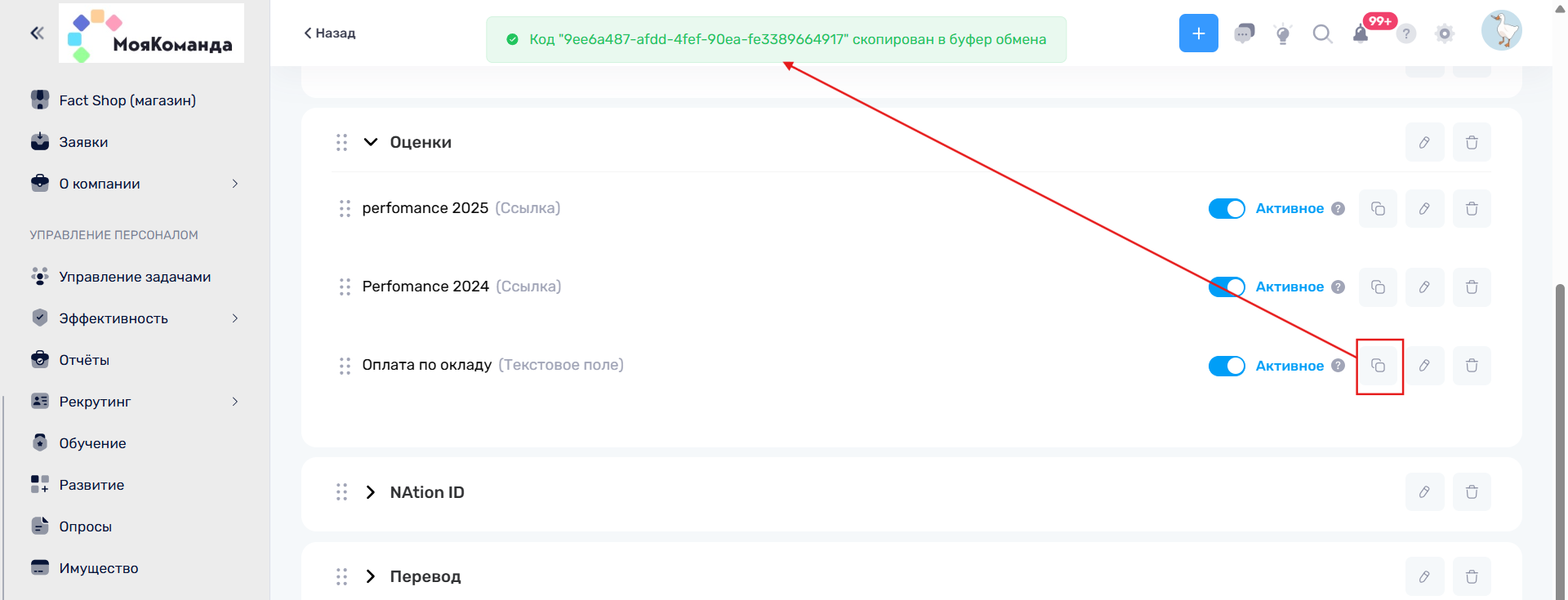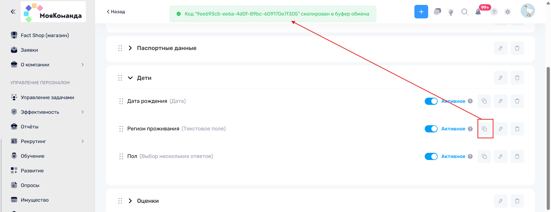 3. После создания поля нужно перейти в выбранный вами раздел и скопировать Код поля. Для этого достаточно нажать на кнопку “Скопировать код поля”. Сверху появится всплывающее окно, сообщающее о том, что код поля успешно скопирован.