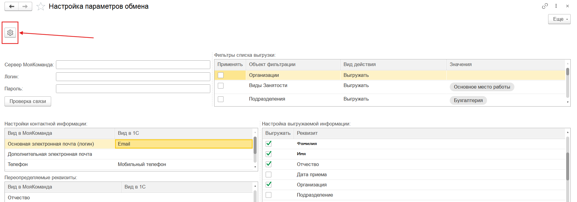 5. Ниже настраиваем личные параметры сотрудников (E-mail, телефон) которые будут выгружаться в МояКоманда. Основная электронная почта - первичный реквизит, использующийся для проверки существующих аккаунтов и избежания создания дублей (логин в Моей Команде).