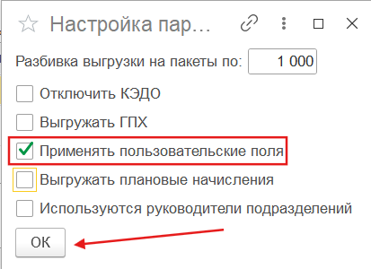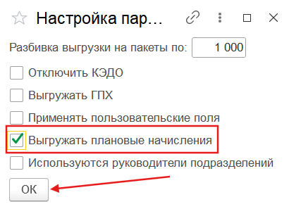 2. В пункте меню «Настройка параметров обмена» по кнопке «Дополнительные настройки» включить чек-бокс «Выгружать плановые начисления»