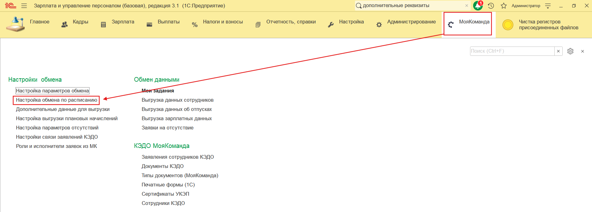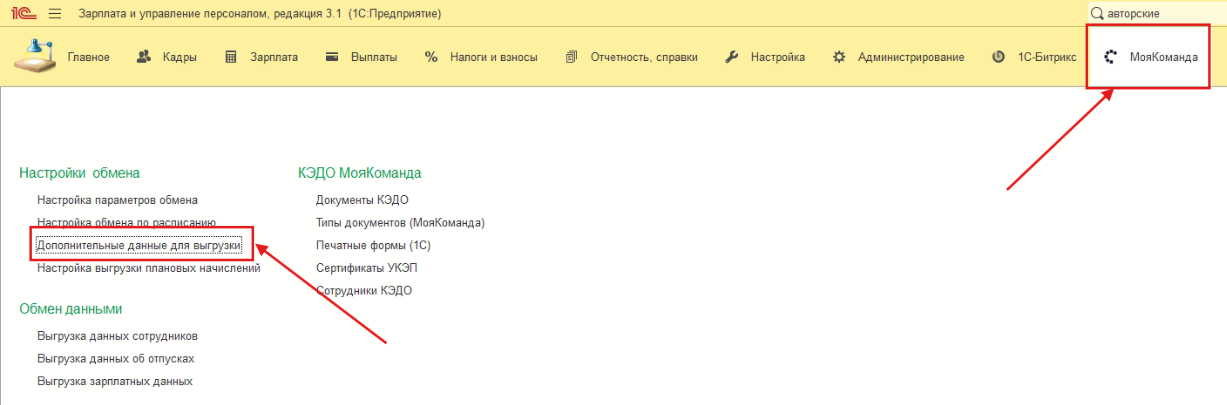 5. Для того, чтобы создать кастомное поле на стороне 1С нужно перейти в раздел “МояКоманда” и выбрать пункт меню “Дополнительные данные для выгрузки”