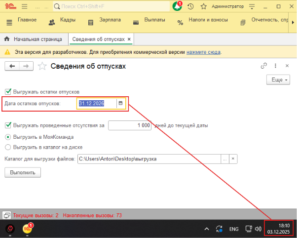 2. Выберите пункт меню “Выгрузка данных об отпусках” на стороне 1С и укажите “Дата остатков отпусков” 31.12.[Будущий год]