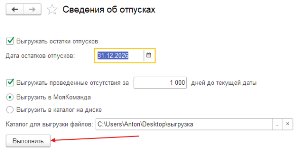 4. После составления графика отпусков можно обратно включить выгрузку по расписанию, либо провести выгрузку остатков отпусков на текущую дату вручную.
