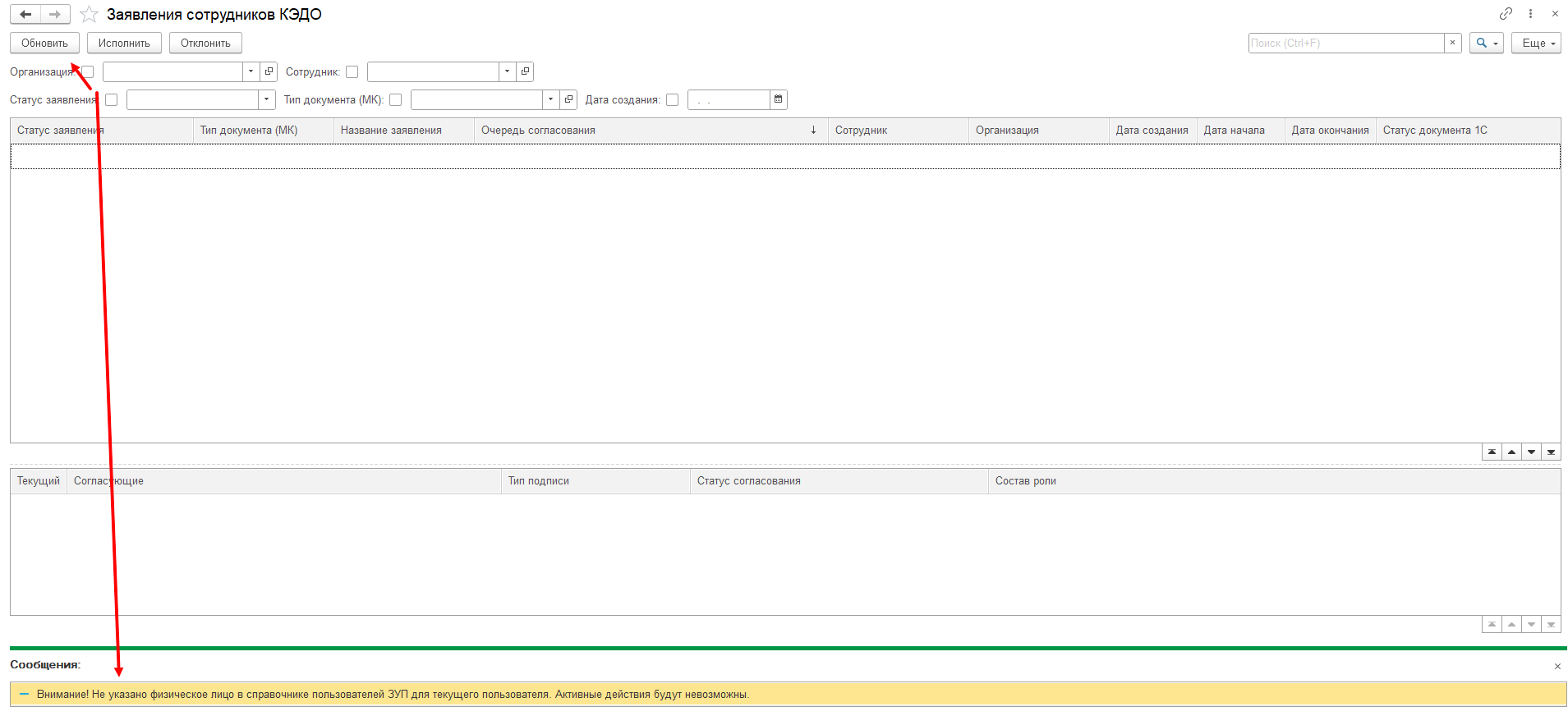 Важно! Если у Вас в разделе «Заявления КЭДО» появилась ошибка «Внимание! Не указано физическое лицо в справочнике пользователей для текущего пользователя», в этом случае необходимо, чтобы для Вашего пользователя 1С в справочнике «Пользователи» было назначено соответствующее Физическое лицо, от которого Вы будете согласовывать.