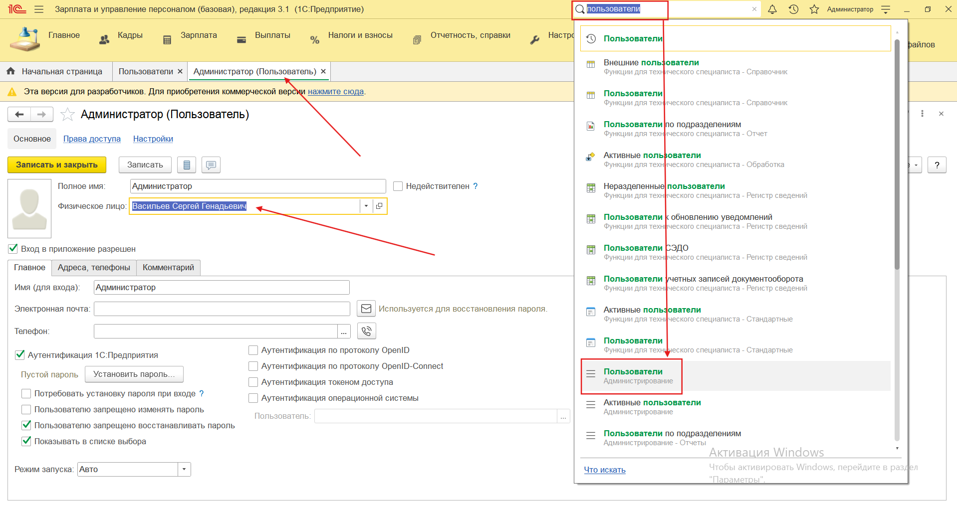 2. Запускаем 1С:ЗУП и заходим в пункт меню «Администрирование».