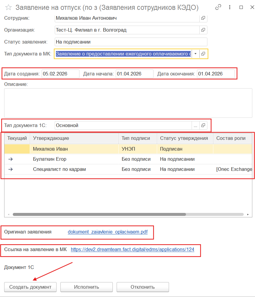 5. На стороне 1С можно просматривать текущий маршрут подписания, видеть кто находится в очереди, открыть PDF-файл заявления, перейти по прямой ссылке на заявление в МояКоманда и также, если шаблон заявления связан с типом документа 1С, создать соответствующий документ, куда подтянутся связанные ранее поля: Дата начала, дата окончания.