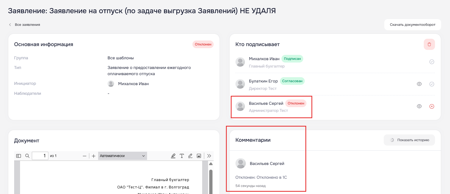 Важно! В случае отклонения заявления на стороне 1С в МояКоманда в детальной карточке заявления в блоке «Комментарии» будет указано, что заявление «Отклонено в 1С».