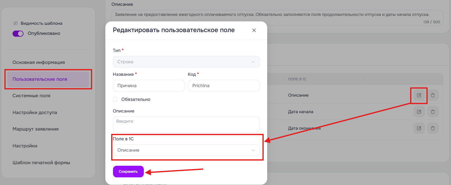 Важно! Для полей с типом «Дата» доступно 2 варианта поля 1С (Дата начала и Дата окончания). Для поля с типом «Строка» доступно на выбор одно поле 1С (Описание). Связать больше двух полей с типом «Дата» или больше одного поля с типом «Строка» нельзя.