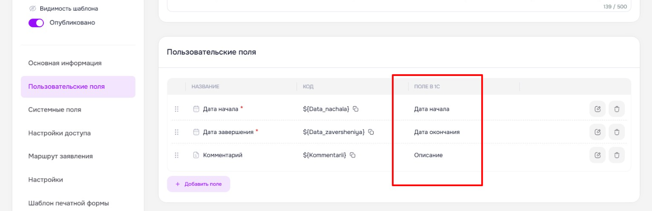 2. Далее необходимо перейти в раздел КЭДО, «Шаблоны заявлений» и для каждого шаблона настроить связь пользовательских полей с соответствующими полями в 1С с помощью новой колонки «Поле в 1С».