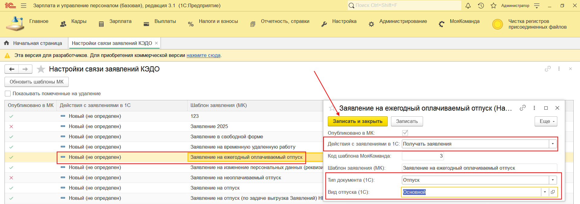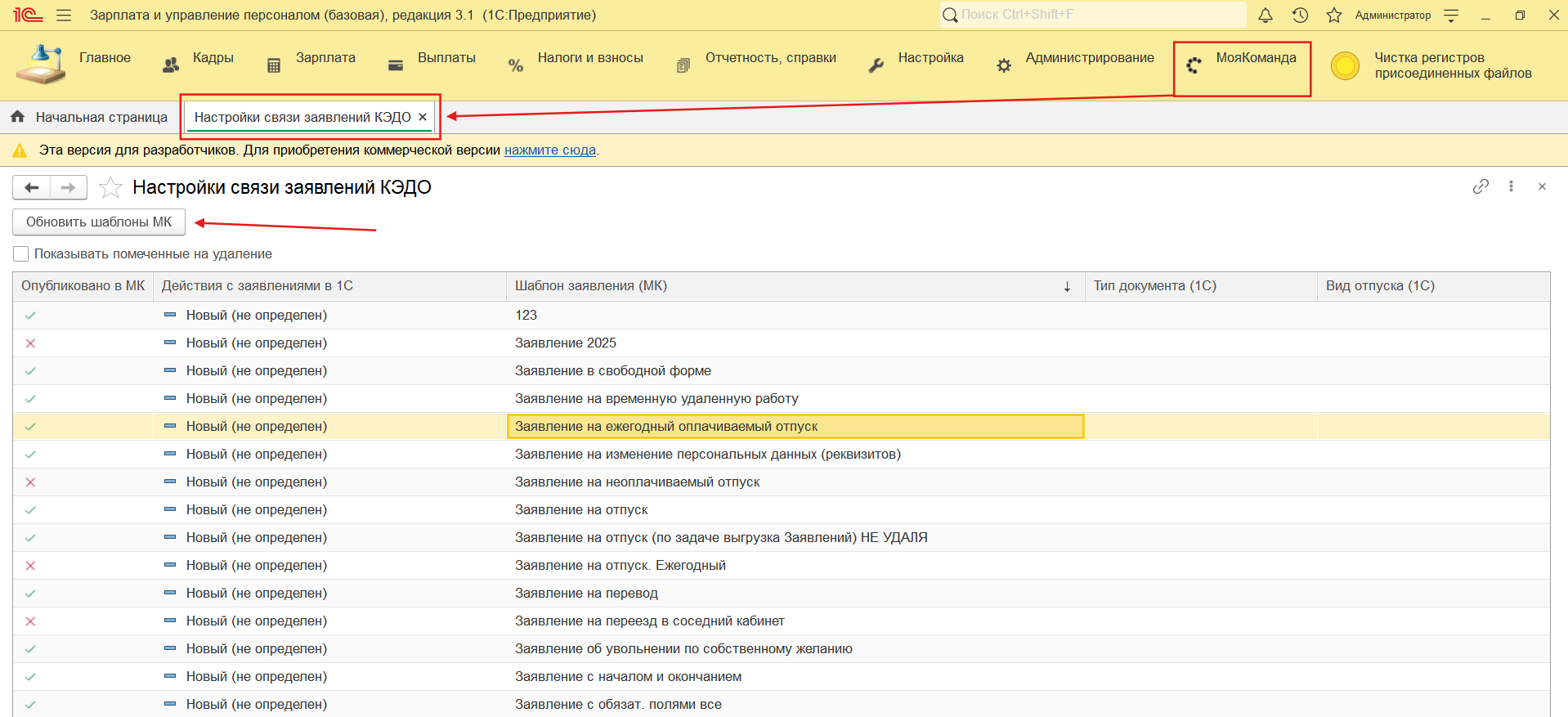 3. При завершении настроек на стороне МояКоманда, на стороне 1С в разделе «Настройка связи заявлений КЭДО» можно получить список шаблонов с помощью кнопки «Обновить шаблоны МК» и настроить правила получения заявлений, а также связать шаблон с видом отсутствия в 1С.