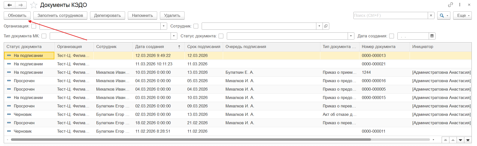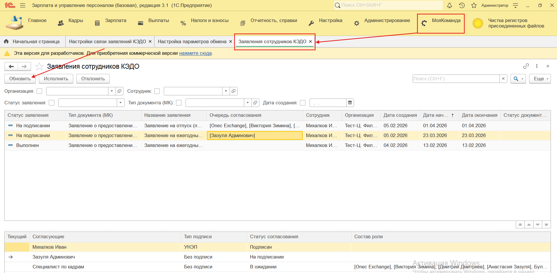 При нажатии на кнопку «Обновить» в таблице появятся заявления сотрудников, связанных с этой базой 1С.