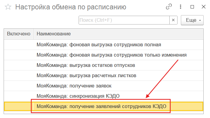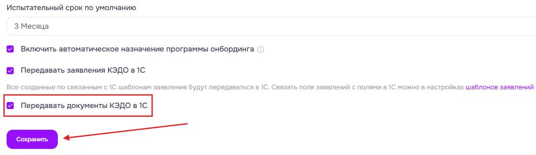 1. Для того, чтобы выгрузить заявления КЭДО из МояКоманда в 1С, необходимо на стороне МояКоманда включить чек-бокс “Передавать заявления КЭДО в 1С”.