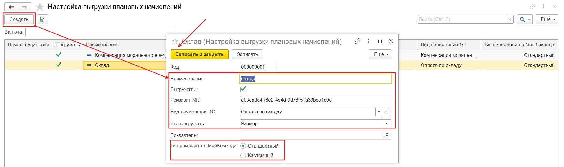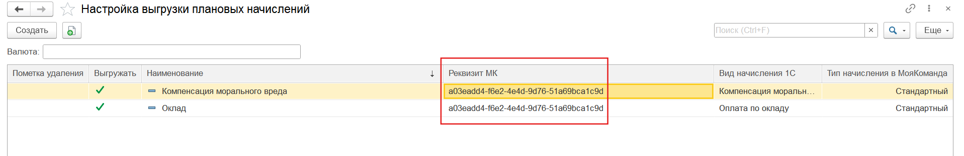Важно! В одно поле МояКоманда можно выгружать несколько видов плановых начислений, для этого при создании начисления на выгрузку нужно указать один и тот же вид Реквизита МК. В этом случае 1С сама вычислит сумму начислений по сотруднику.