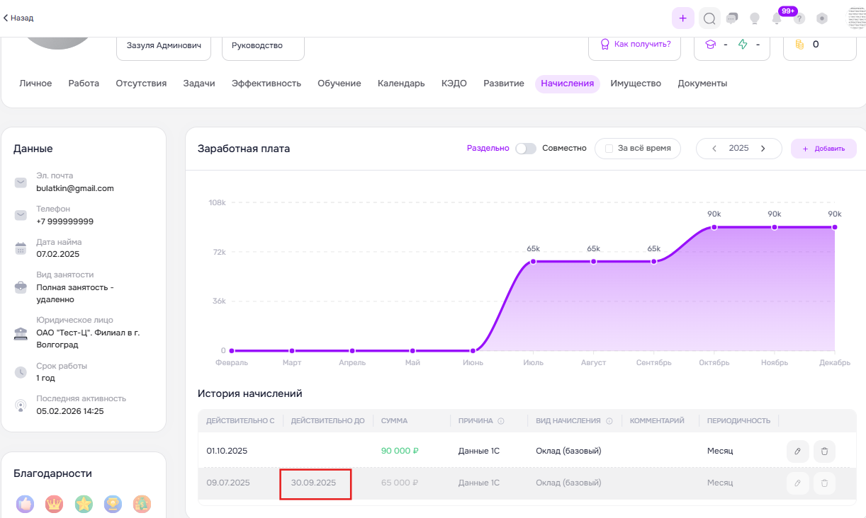 9. Плановые начисления будут отображаться в профиле сотрудника в разделе “Начисления”, на графике можно будет увидеть с какого числа действует текущее плановое начисление и его размер до вычета налога. Также в случае изменения начисления (понижения, повышения, добавления нового вида начисления в 1С и т.д.), старое начисление в профиле сотрудника станет неактивным с “датой завершения” = “дате начала нового начисления - 1 день” и будет выделено серым цветом в таблице.
