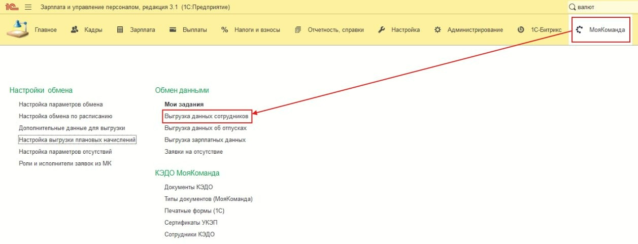 7. После того как связь всех полей настроена на стороне МояКоманда и на стороне 1С можно начинать выгрузку данных. Для этого нужно перейти в раздел “Моя команда” и выбрать пункт меню “Выгрузка данных сотрудников”.