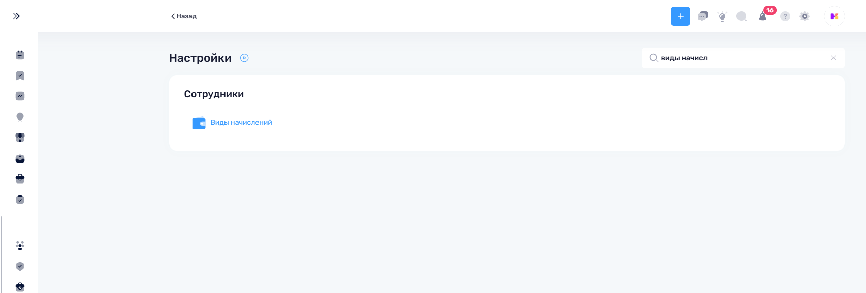 3. В блоке “Сотрудники” выбрать “Виды начислений”;