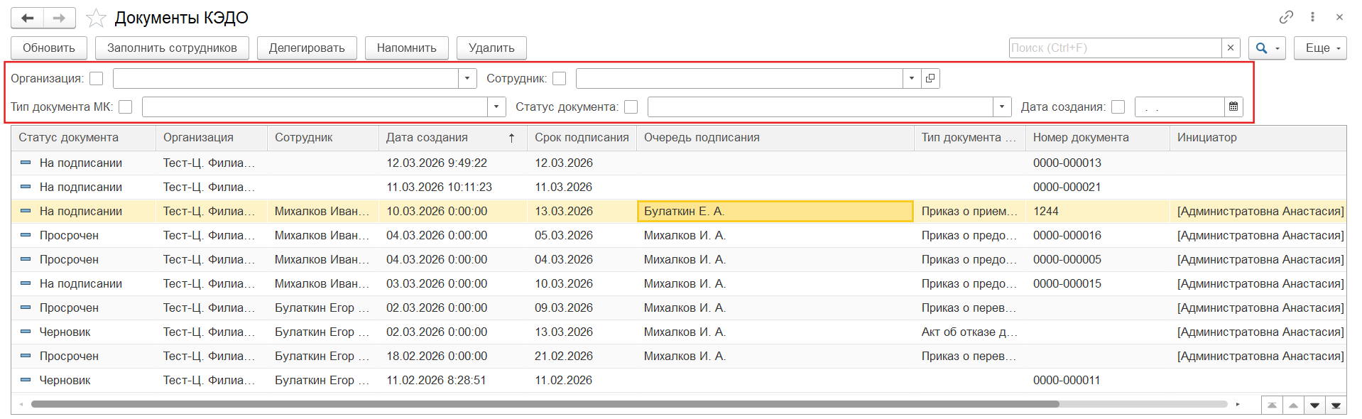 Использовать фильтры по Организациям, Сотрудникам, Типам документа МК, Статусам документа, Дате создания.