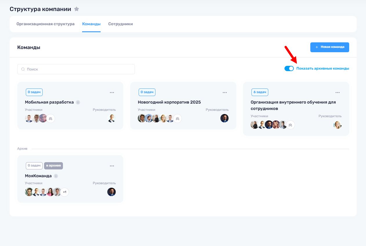 При нажатии на "Показать архивные команды" откроется блок "Архив", где будут отображены команды, находящиеся в архиве