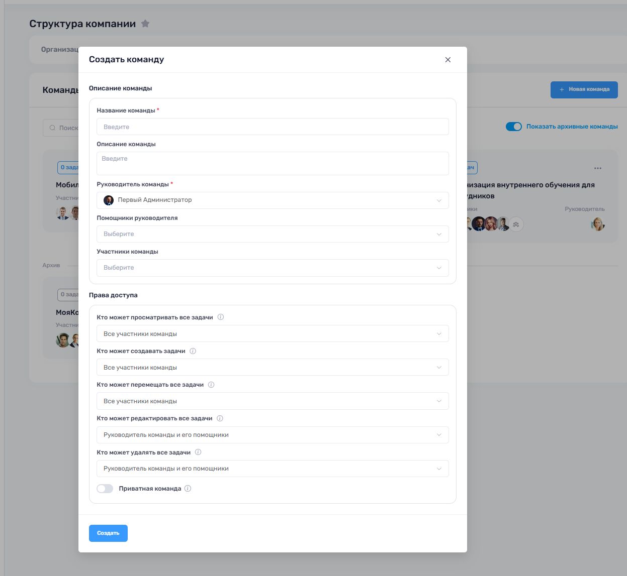 При создании или редактировании команды можно определить, кто может видеть, создавать, перемещать, изменять и удалять задачи, чтобы каждый сотрудник имел доступ только к тем действиям, которые ему положены по роли.