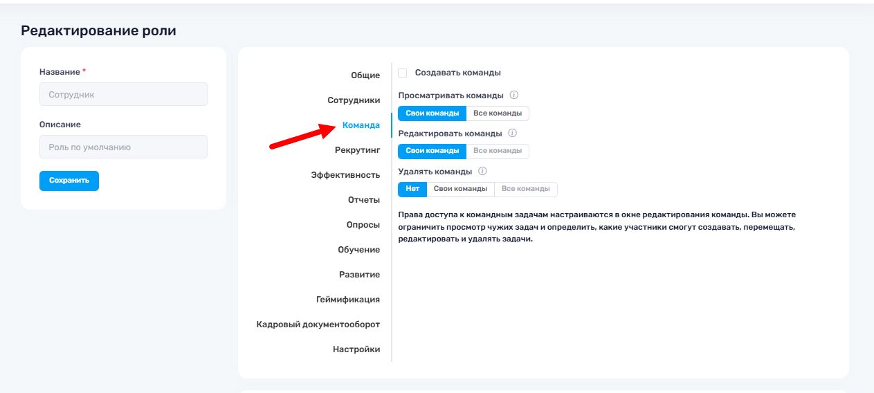 Настройка прав доступа к командам осуществляется на странице редактирования роли, во вкладке «Команда».
